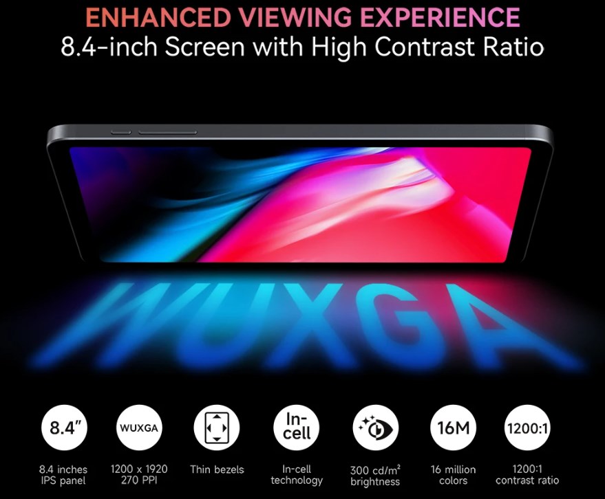 ディスプレイは8.4型とコンパクトながら1,920×1,200のWUXGAパネルを搭載!画素密度も270ppiなのでタブレットとしてはかなり高精細。In-CELL方式なので映り込みも少なそう!