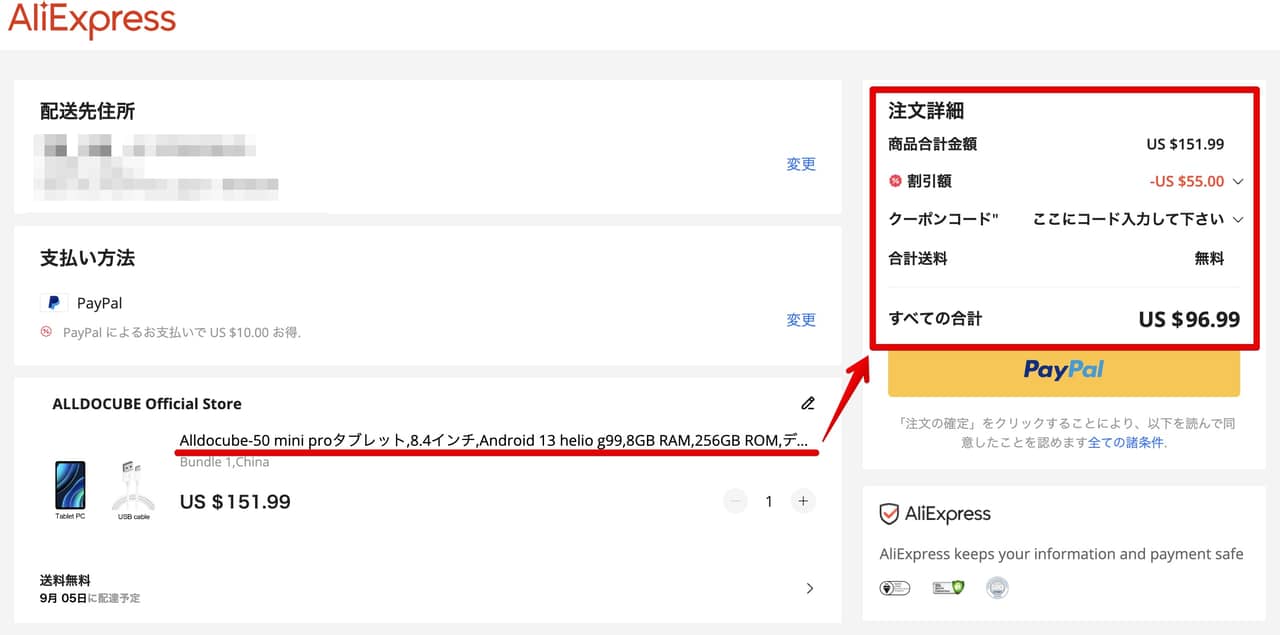 ▼[AliExpress]夏の感謝セールクーポン+PayPal支払割引+ガルマックスクーポン適用で96.99ドル↓