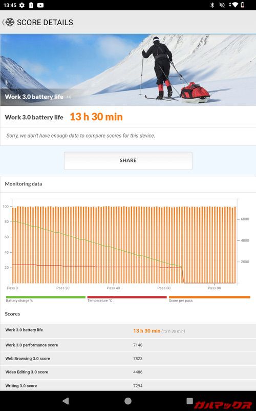 PCMarkのバッテリーテストでは13時間30分とまずまずの結果でした。