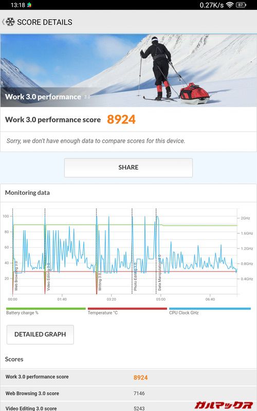 本機が搭載しているSoCはミドルレンジのHelio G99でAnTuTuだと総合スコアが約40万点前後です。