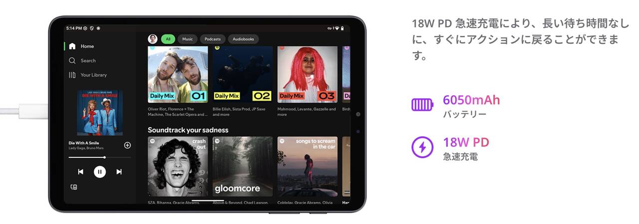 | バッテリー | 6,050mAh 18W |