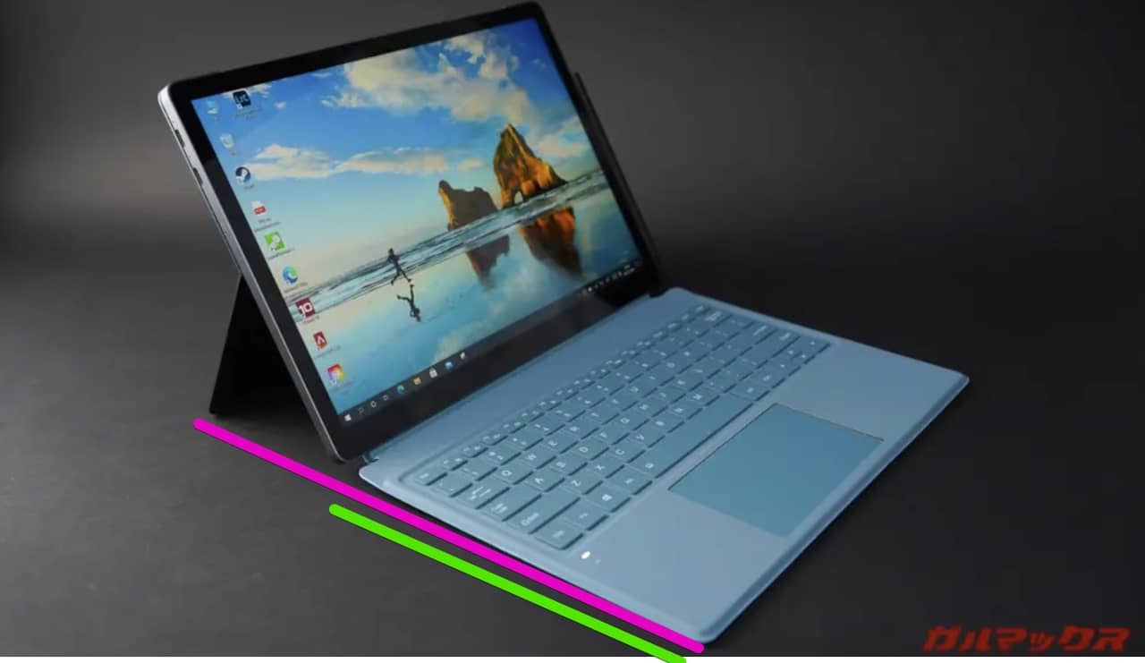 ▼緑の線はノートPCで必要な接地面積なんですが、キックスタンドはより多くの設置スペースが必要なんです。↓