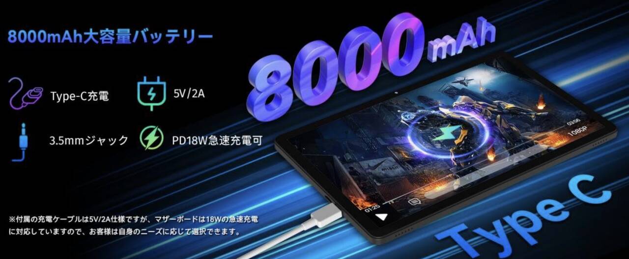 バッテリー容量は8,000mAhを搭載していて18W充電に対応!
