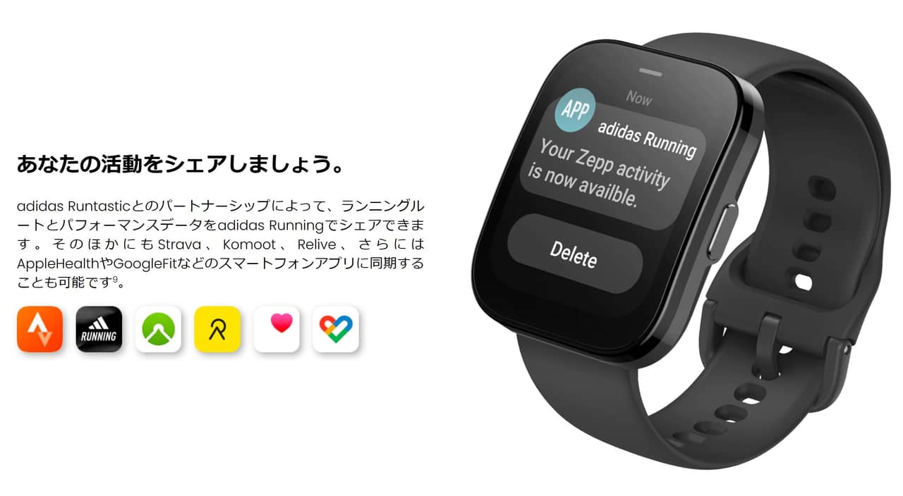 ▼あとサードパーティー連携も充実しているのがAmazfitモデルならではな魅力!AdidasやGoogle Fitアプリなどとの運動記録の共有も可能となっています。↓