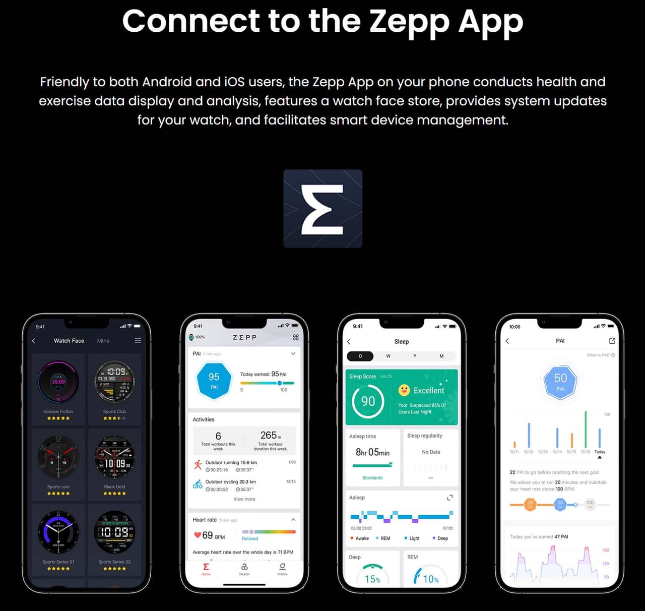 ▼iOS、Android向けアプリであるZepp Appを使うことで測定したデータの確認や文字盤カスタマイズといった様々な機能も便利に使えるぞ。↓