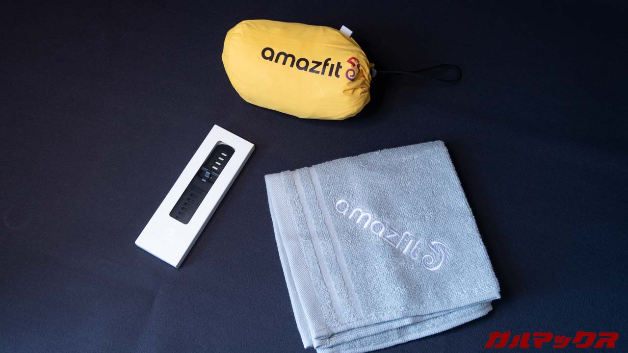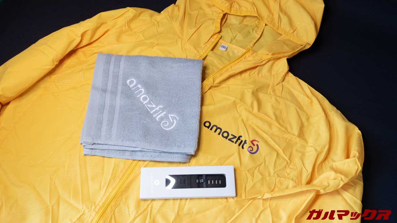 ▼Amazfitオリジナルのグッズは大判なハンカチとウェアと、ゴムゴムのスペアバンドの3つが入ってた!ウェアは真っ黄色ですごい目立つ!いや〜、こういった特別なサプライズ品に触れるのはこの仕事の醍醐味っすね!↓
