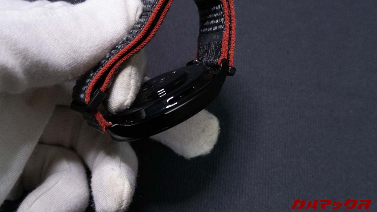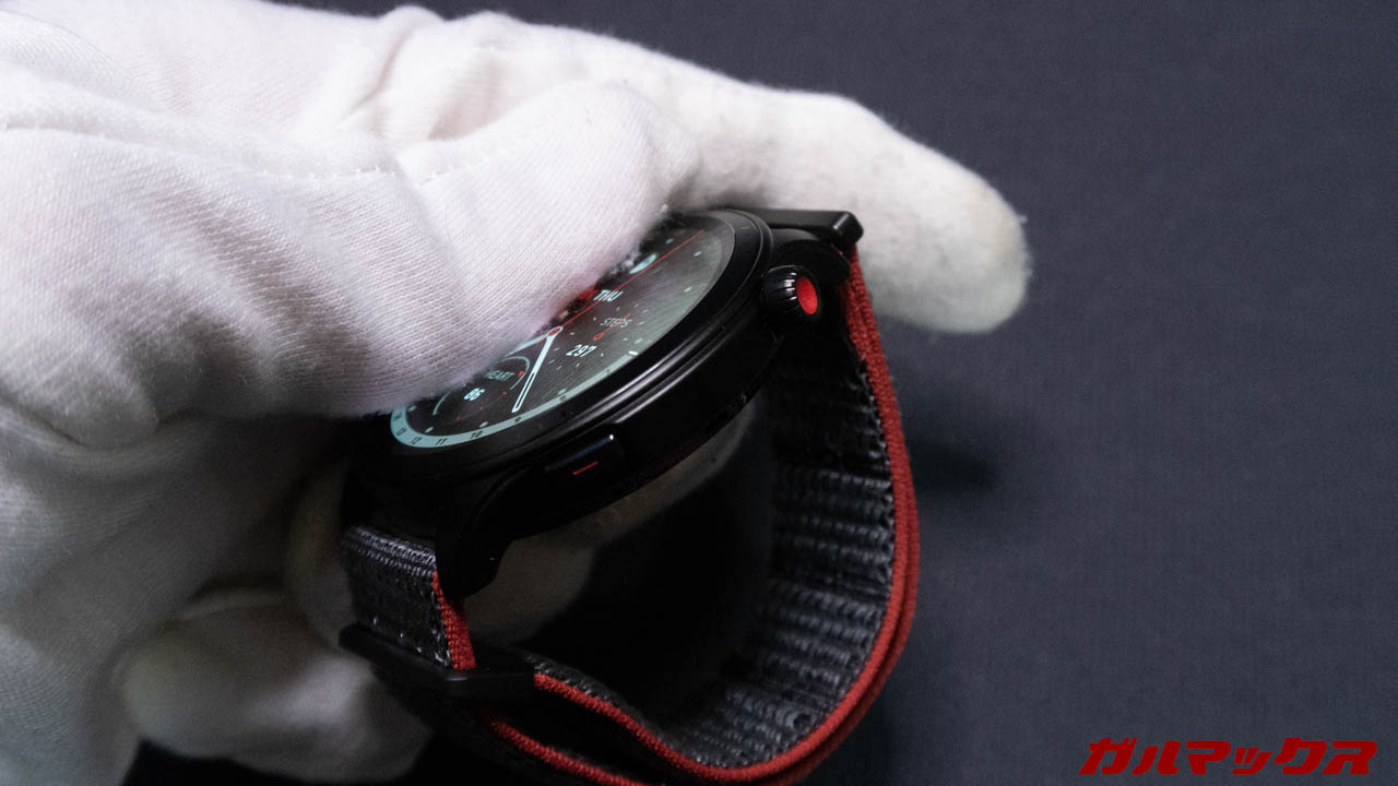 ▼側面にはクラウンボタンとボタンが配置されており、赤いアクセントカラーがスポーティー!スポーツハッチバックに乗っている筆者からしたら、赤いスポーティーなアクセントカラーは雰囲気あってすごく好き。↓
