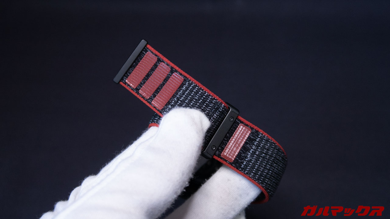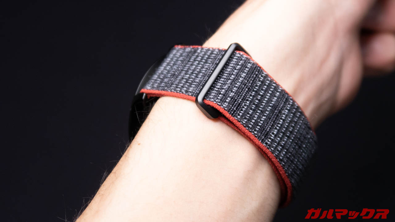 ▼このバンド、赤のアクセントがある非常にレーシーな見た目!マジックテープで留めるのでフレキシブルに調節できるし、ナイロン素材で水に濡れてもすぐ乾きそう。まさにスポーティー!↓