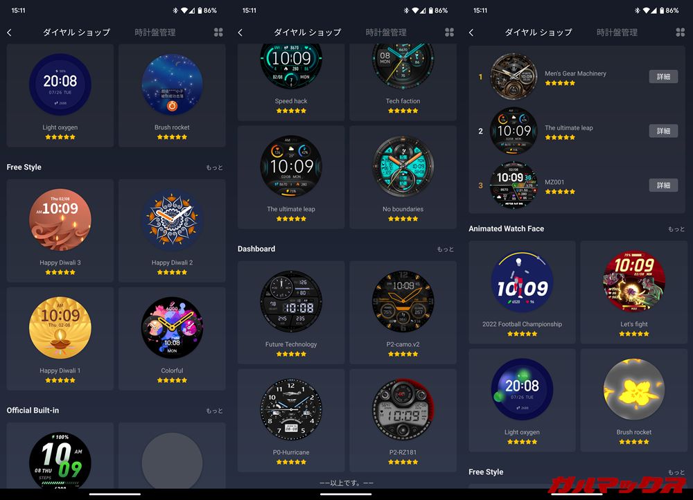 ▼画面がいいだけじゃなく、文字盤デザインの多さも素晴らしいし、天気とか身体データを同時に表示できるものもあり、機能性も素晴らしすぎる!これこそオレの求めてたものだわ。↓