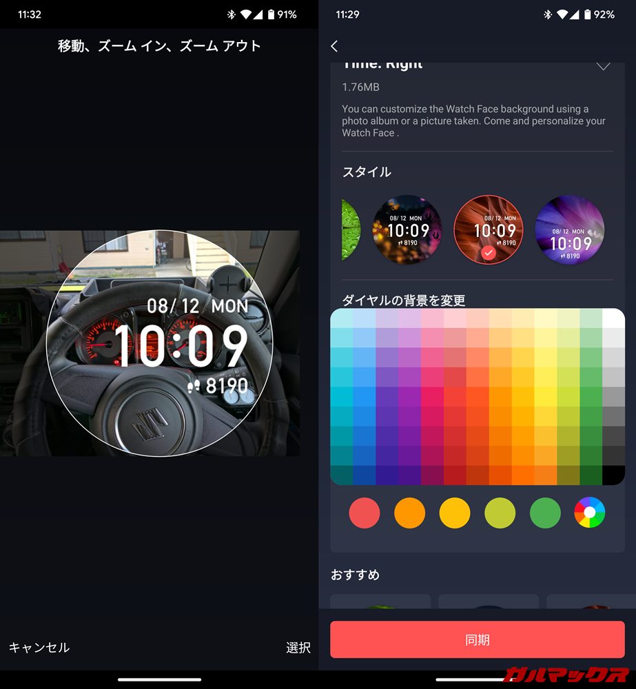 ▼当たり前かもしれませんが、スマホのZeppアプリ経由でスマホの保存した壁紙を突っ込めますし、文字の配置、カラーもしっかり変えられます。車好きな筆者にとっては、コックピットほどスマートウォッチに似合う文字盤は無いぜ。↓