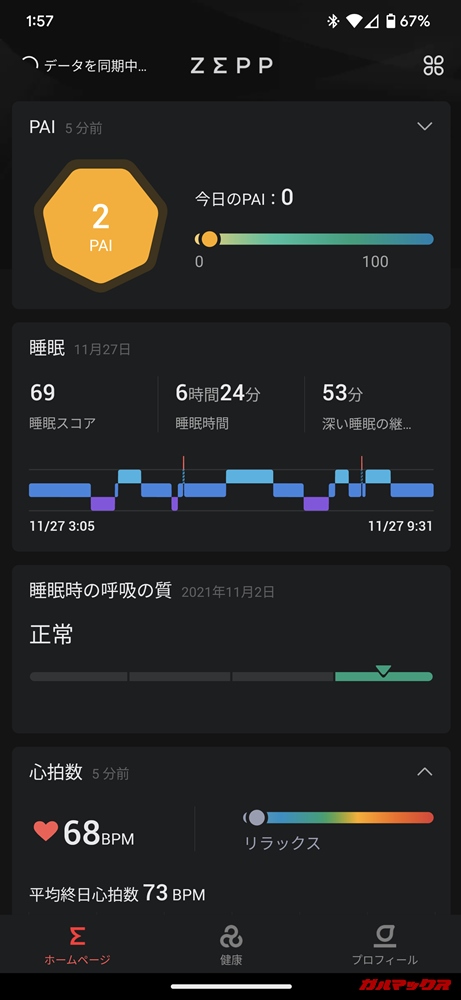 ▼もちろんペアリングしたスマホのZeppアプリからも見られます。本体だけじゃなくアプリの作り込みだけでなく、UIデザインも結構練り込まれてるなって印象でした(`・ω・´)。↓