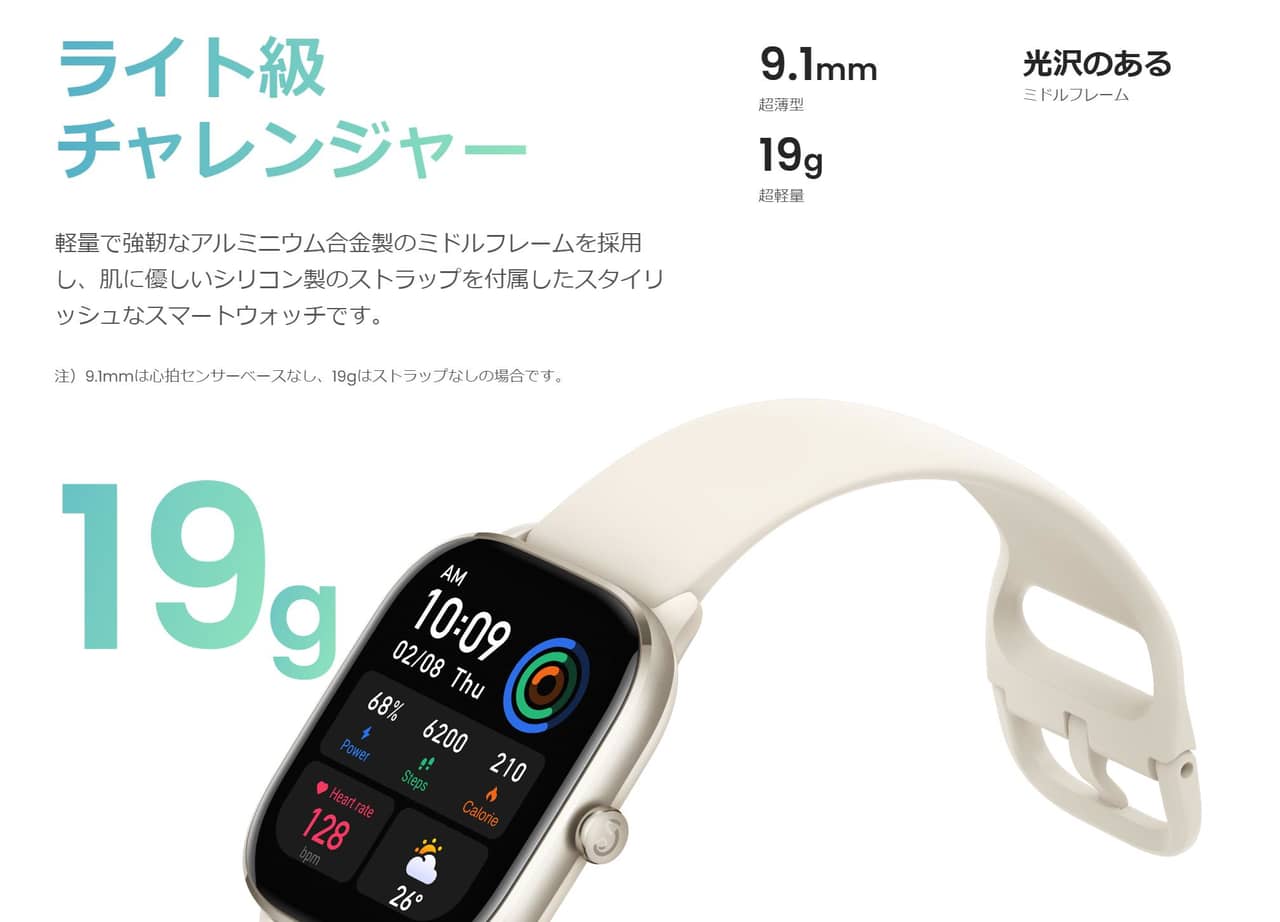 ▼Amazfit GTS 4 Miniのデザインは丸みを帯びた四角形スタイル。特に厚みが9.1mmと抑えられておりけっこう薄型でつけ心地は良さそうです!重さは19g、ストラップ込で31.2gと軽量なのも魅力。どんな腕でも装着の違和感は感じにくいかも。↓