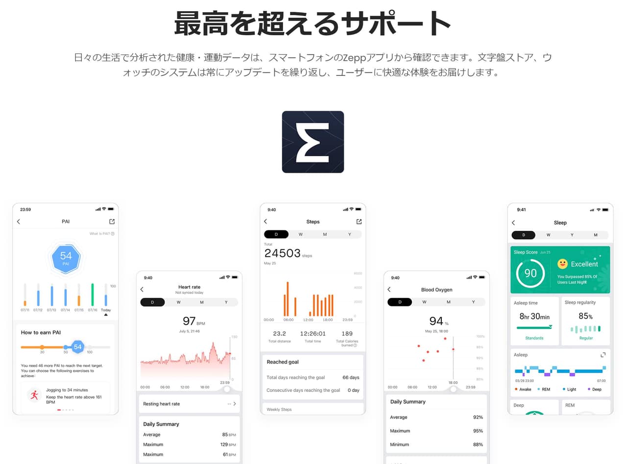 - Zepp OS搭載。電卓にミニゲームなど機能も充実
