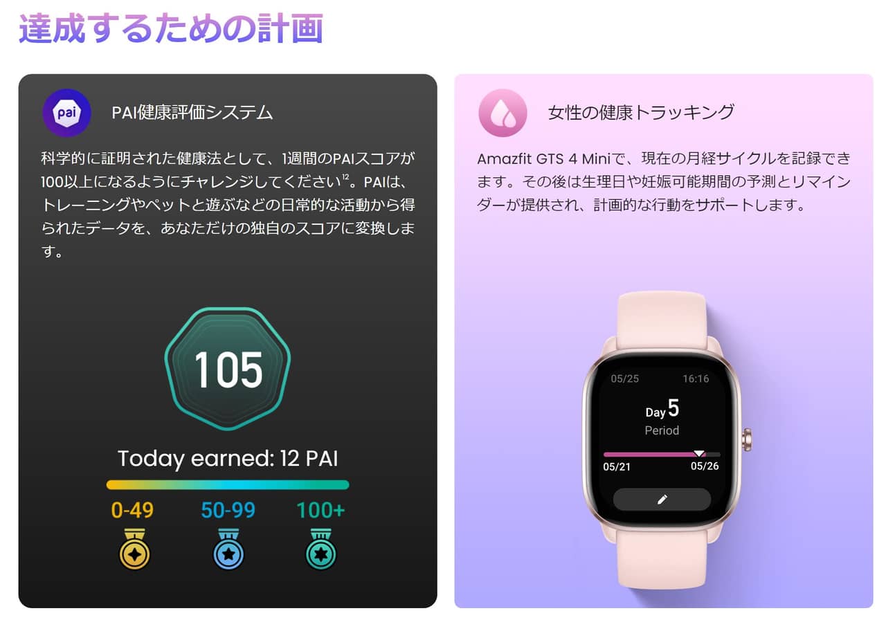 ▼健康度合いや運動アクティビティからPAIというスコアを算出する機能も対応しており、健康指数である100点を目指すサポートもしてくれる他、女性向けの周期の測定・表示にも対応しています。機能性ばっちり!↓