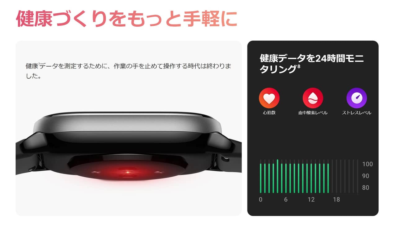 - 心拍数、血中酸素濃度、ストレスの常時モニタリングができる