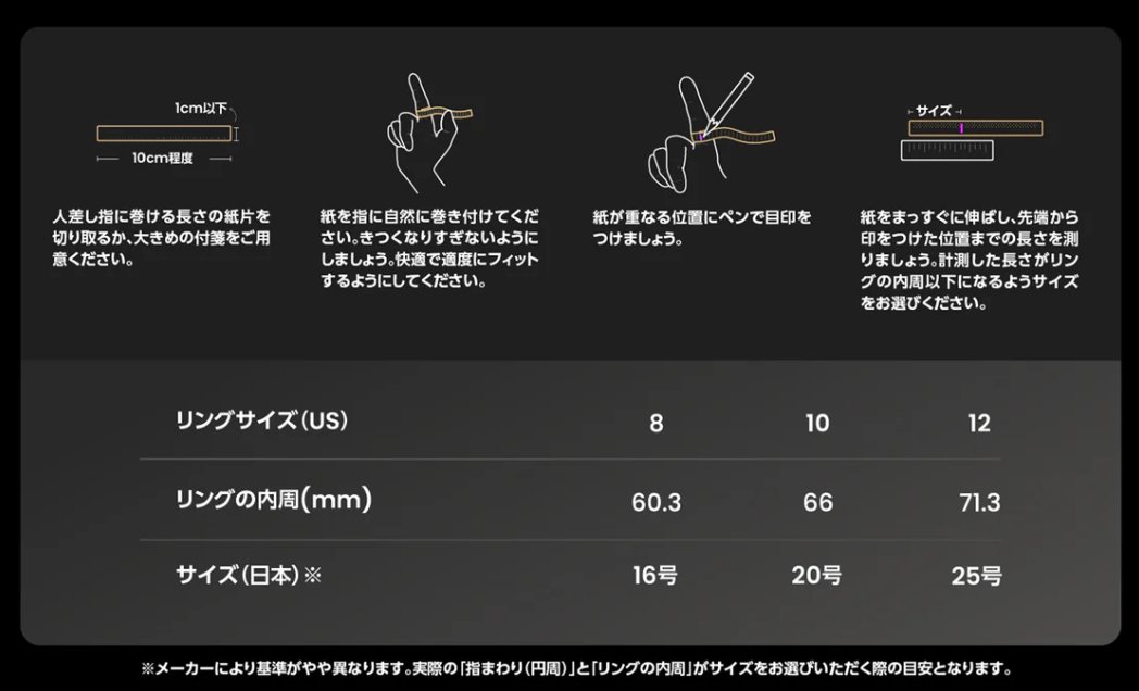 まずはサイズを測りましょう!Amazfit Helio Ringは米国基準(USサイズ)8、10、12の3種類が用意されています。