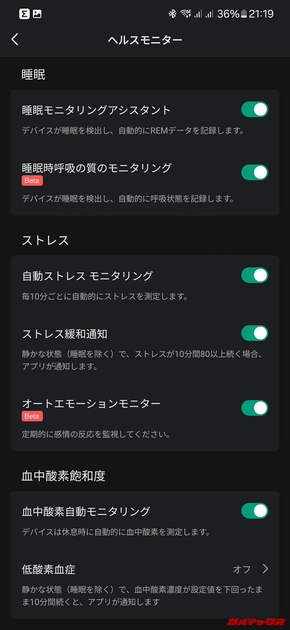 ▼スマートウォッチでもそうなんだけど、このヘルスモニターの項目を全部オンにすれば測定項目は増える一方で電池消費も増加。実使用では2日半ほどとなりました。↓