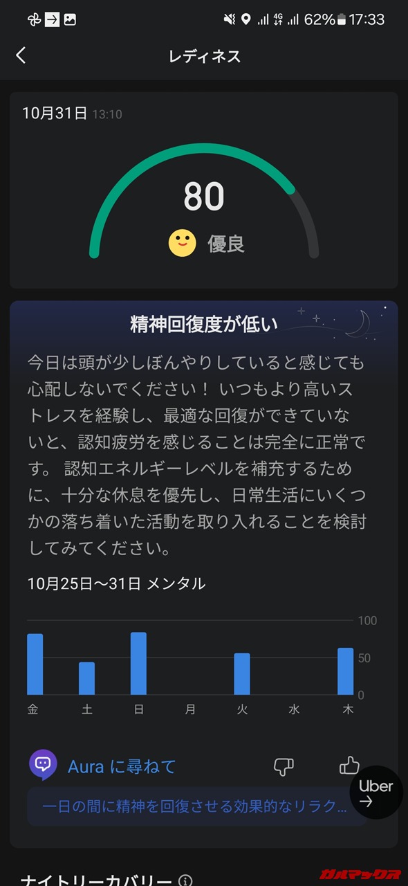 ▼Zepp Auraには睡眠健康評価という機能があり、SAS(睡眠時無呼吸症候群)か否かも測定してくれます。ニ種免持ちの職業ドライバーさんにとってSASか否かはかなり重要で、その一人である筆者にとって嬉しい機能(`・ω・´)。翻訳精度は一部ガバいのは御愛嬌‥。↓