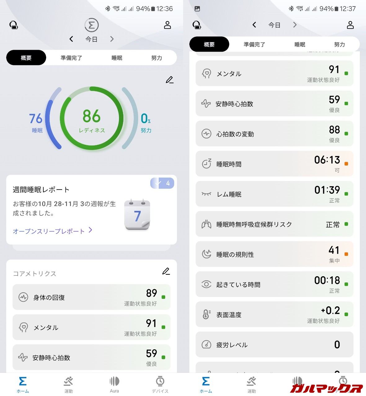 ▼AmazfitデバイスとZeppアプリの特色としてはレディネス機能。身体を動かし運動した後、どれほど疲労から回復したかとか睡眠がとれているかといった情報がわかります。↓