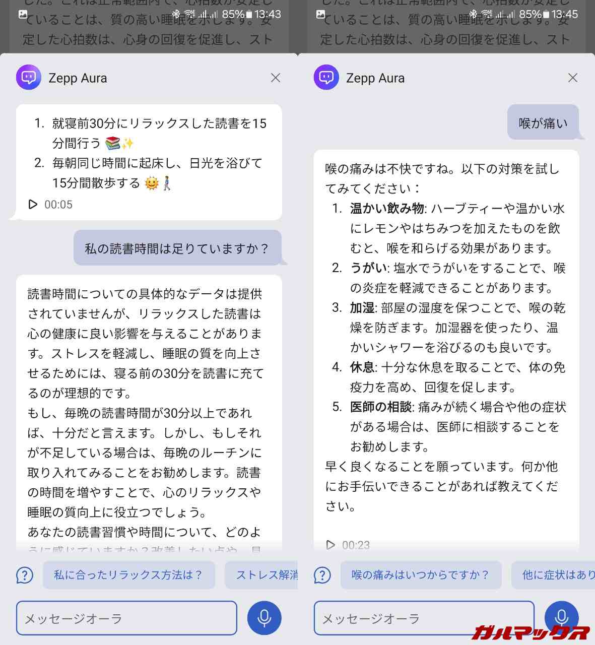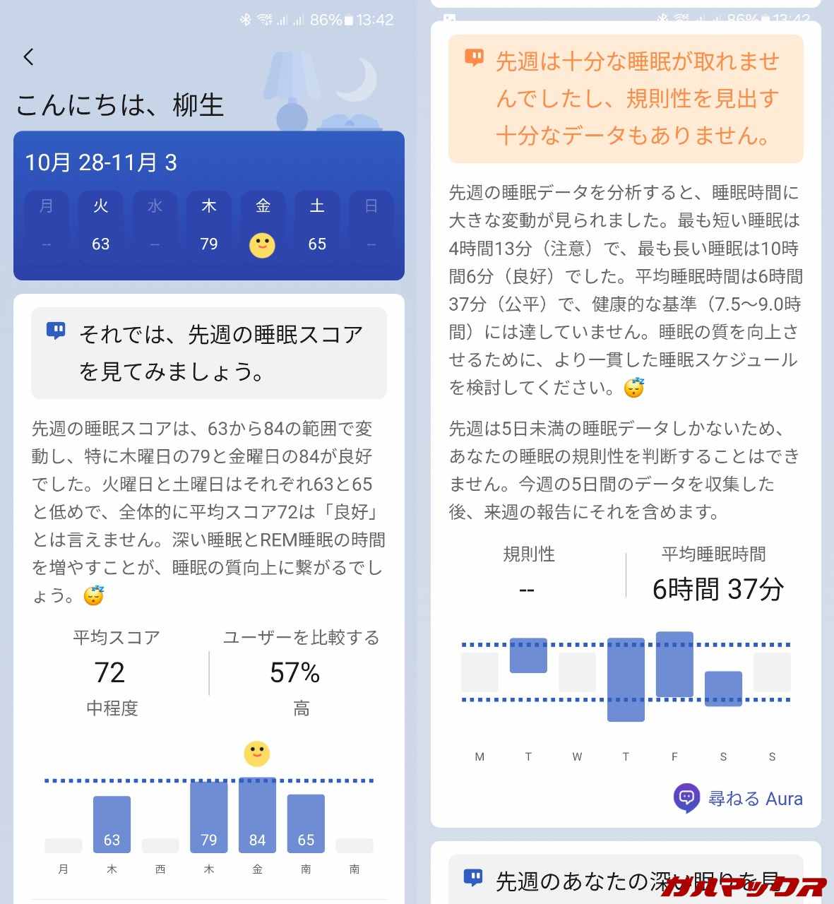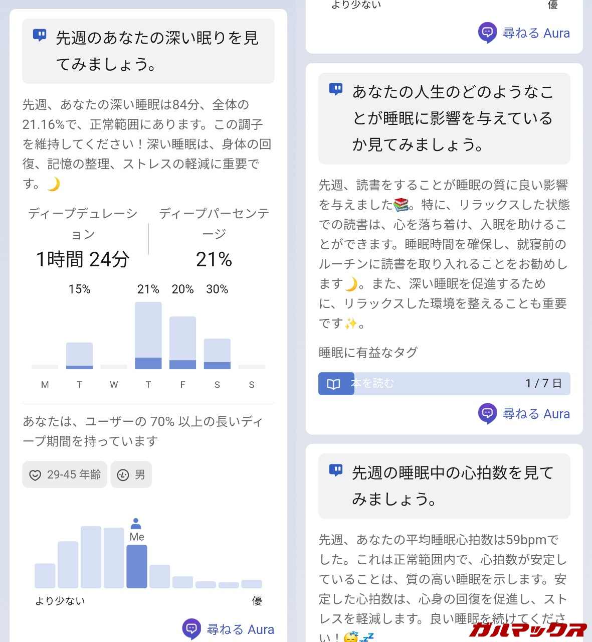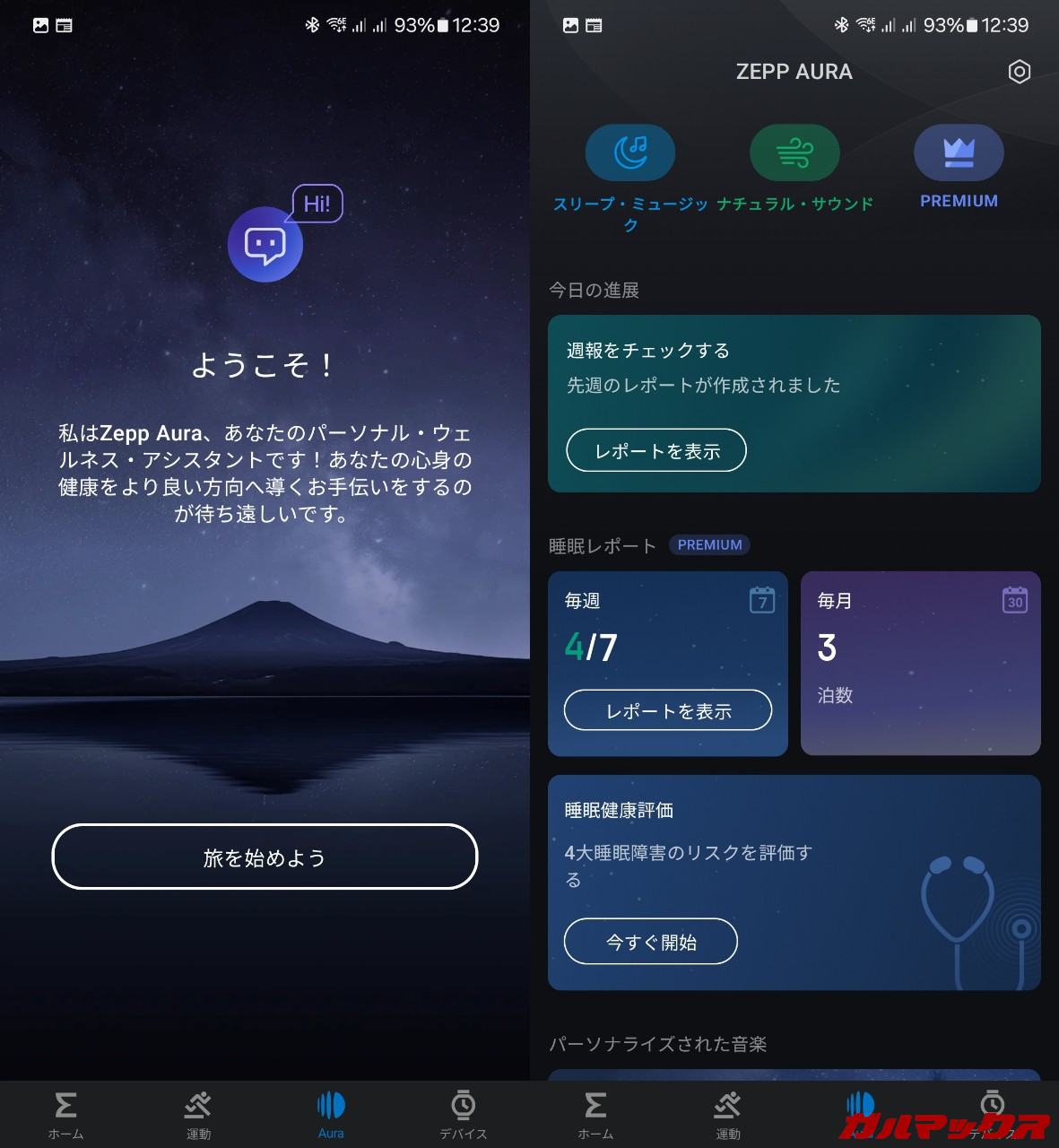 前の取材の際にも軽く紹介したZepp Auraっていう、AIアシスタントが睡眠をサポートしてくれる機能があったんですが、それが無料で使えるのも嬉しいポイント。通常だと月1,500円(年単位だと4,500円、月換算377円)するから結構お得。