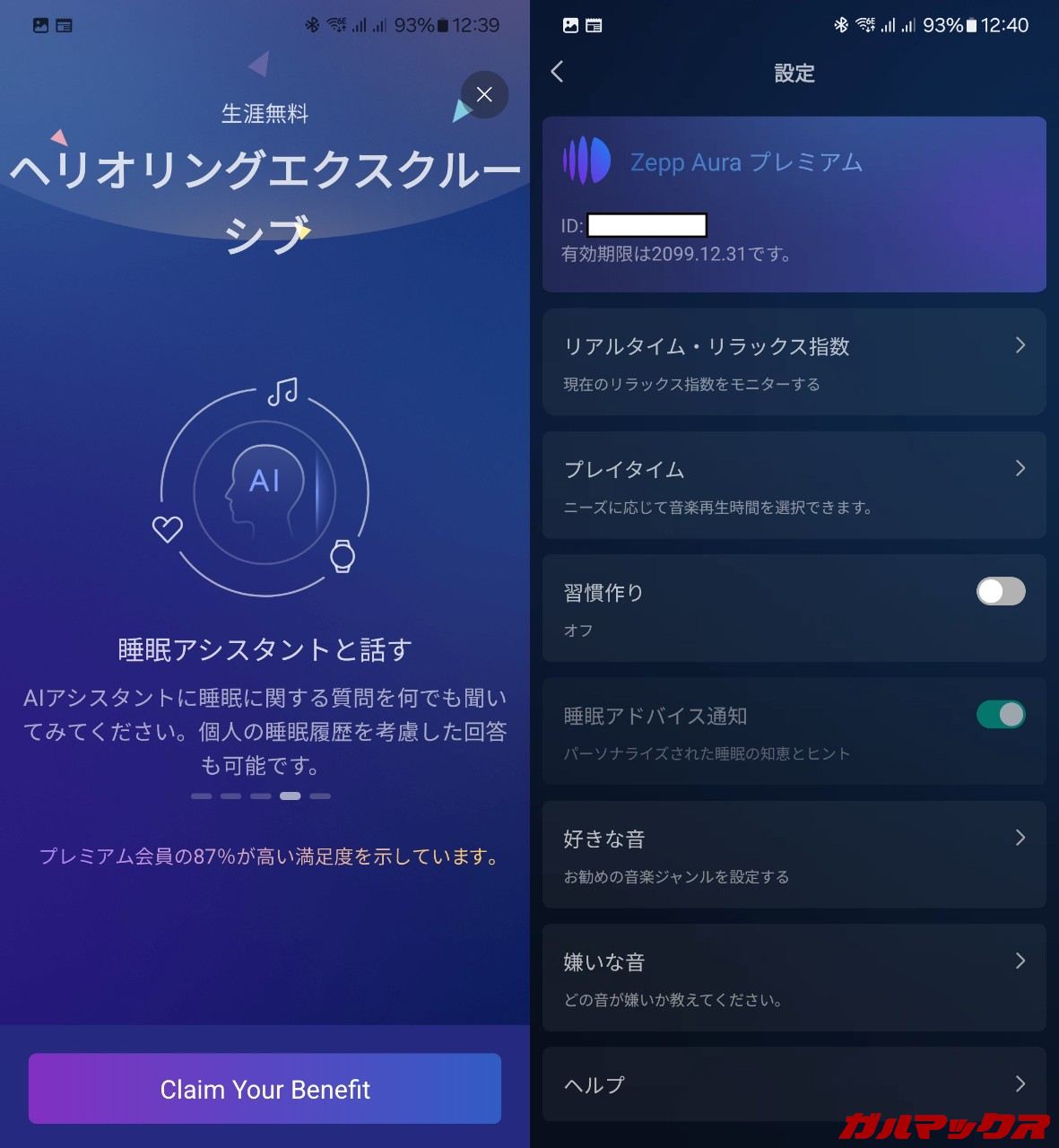 ▼Amazfit Helio Ringを登録後、アプリのZepp AuraってところからClaim Your Benefitを押すことでプレミアム会員になれます。決済手段の登録も不要なのが地味に嬉しい。↓