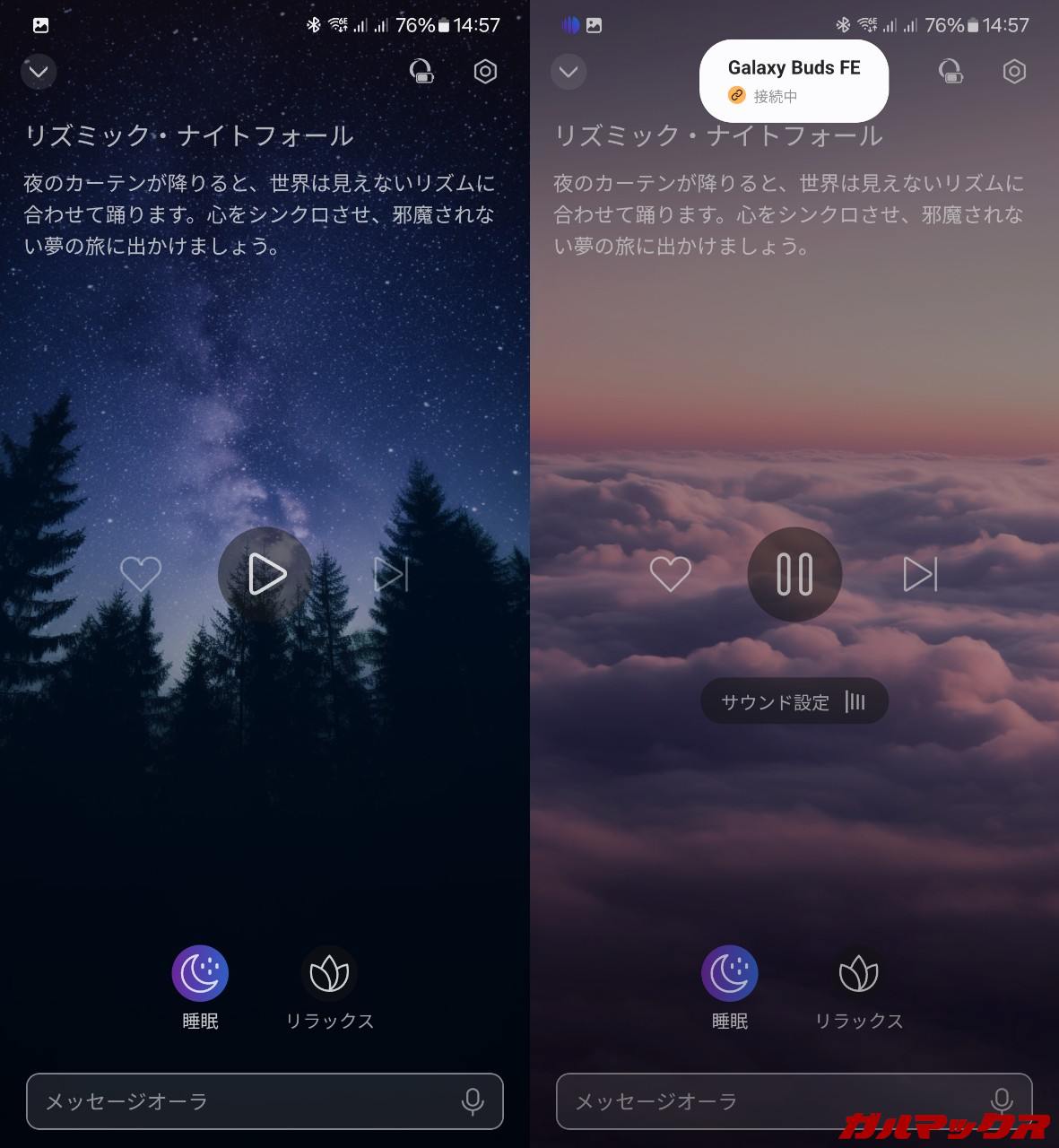 ▼リラックスや睡眠導入のための環境音も用意されています。人混みだったり夜の森だったり雨だったり、またAuraに頼むことでそれらの組み合わせも可能。YouTubeと違って広告が挿し込まれる可能性もありません。↓