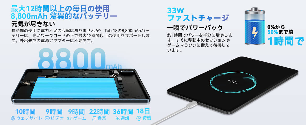▼バッテリー容量は8,800mAh、最大33Wの急速充電にも対応と中々に良いスペック!↓