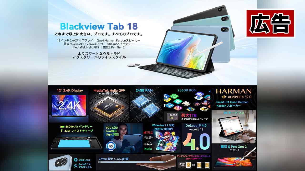 Blackview Tab 18がAmazonでセール!Helio G99搭載、12インチ大画面、NetFlix対応のWidevine L1タブレットが安いぞ!