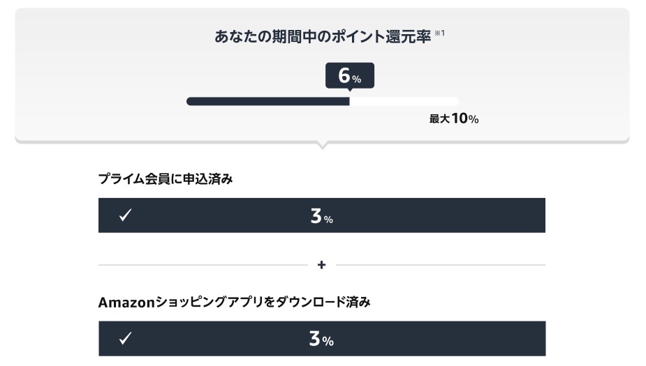 ▼とりあえずAmazonプライム会員でAmazonショッピングアプリを使って買い物すると6%のポイントが貰えます。このくらいは簡単にクリアできそう!Amazonクレカ持ってる方は更にポイントアップするみたいですよ!↓