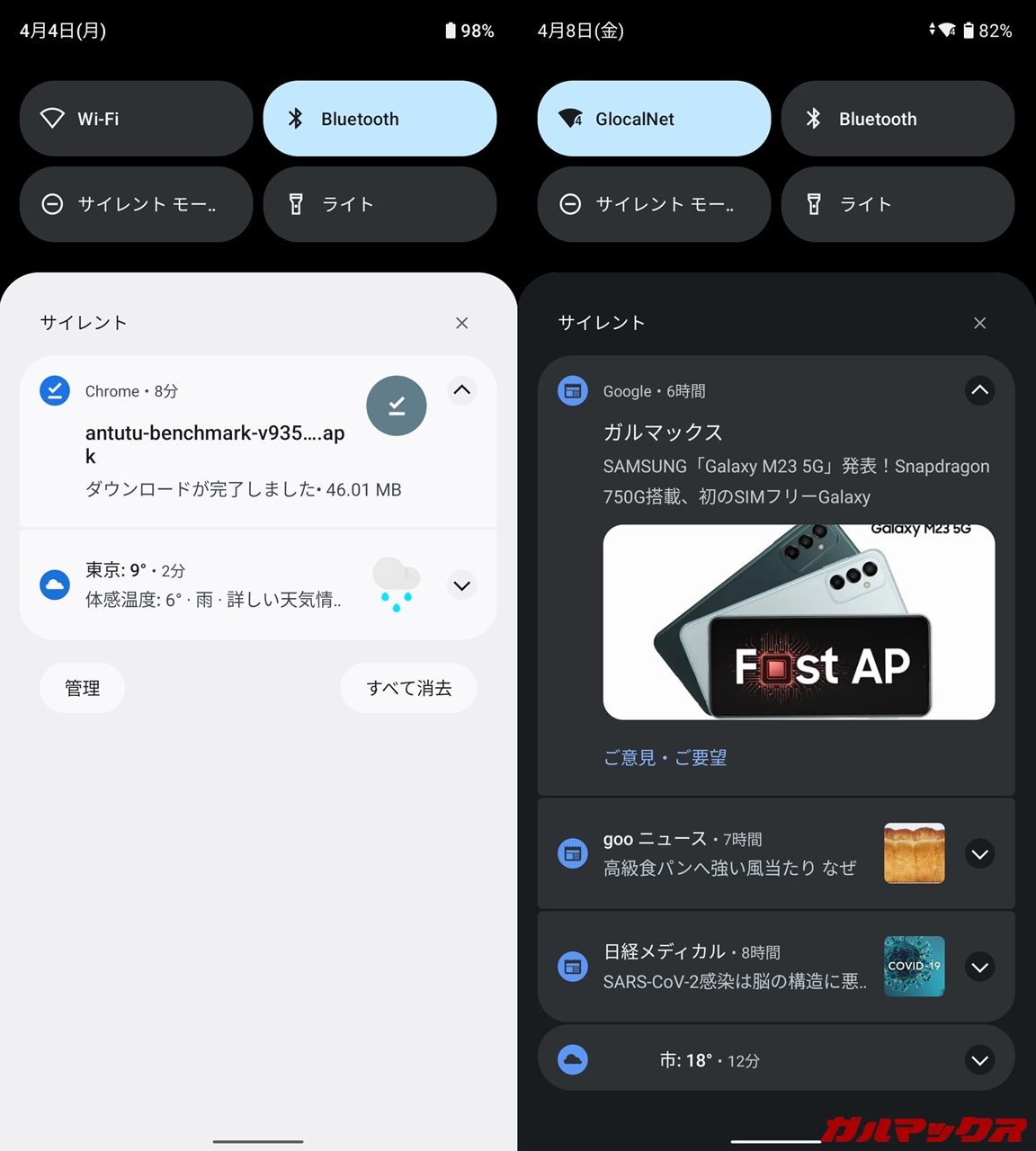 ▼現行最新OSのAndroid 12を内蔵!そのため11以前のものよりもUIデザインは大幅に変わっています。筆者としてはプレーンでミニマルな外観デザインは好き。あと、通知メニューのWi-Fiとモバイルデータ項目も独立しており扱いやすかった!↓