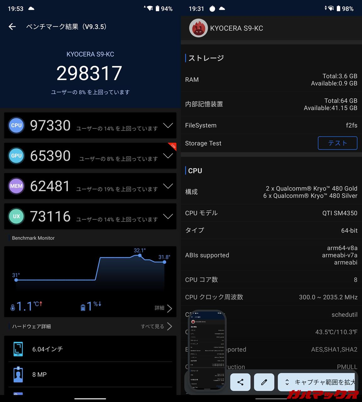 ▼Android One S9の実機でAnTuTu(Ver9)を測定しました!総合スコアは298,317点、GPUスコアは65,390点です!↓