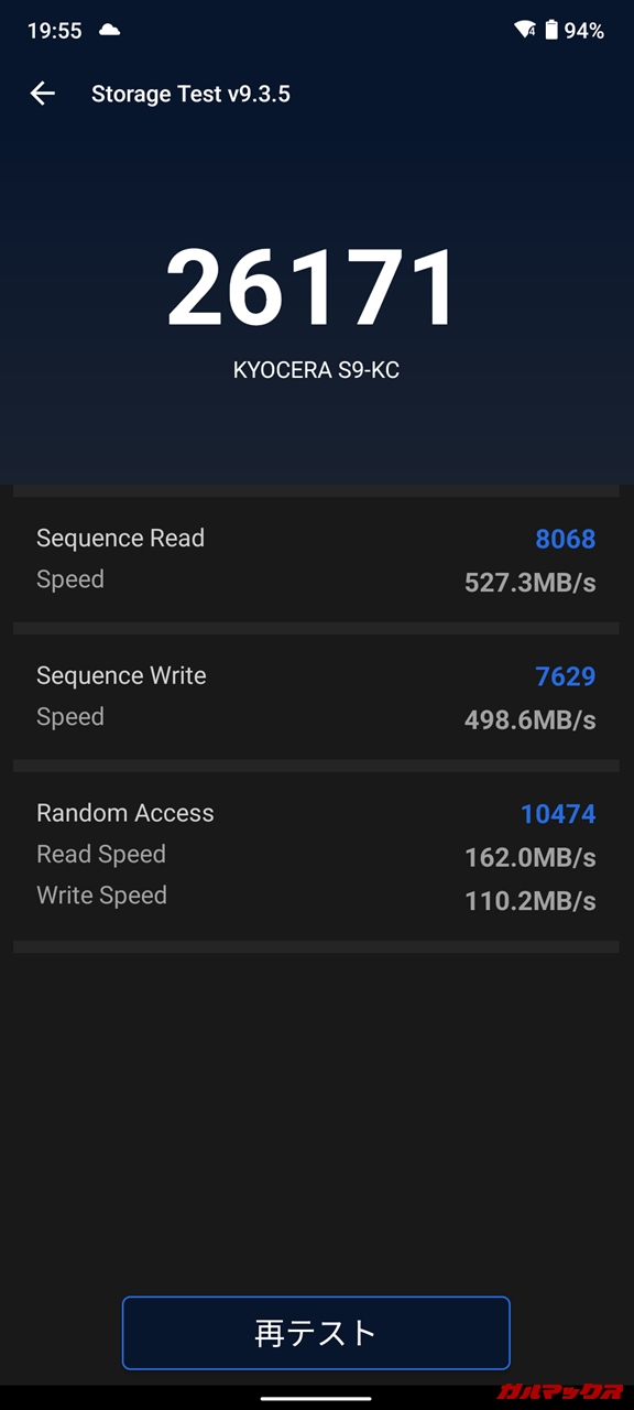 ▼ストレージ速度は読み込みが527.3MB/s、書き込みが498.6MB/s。↓