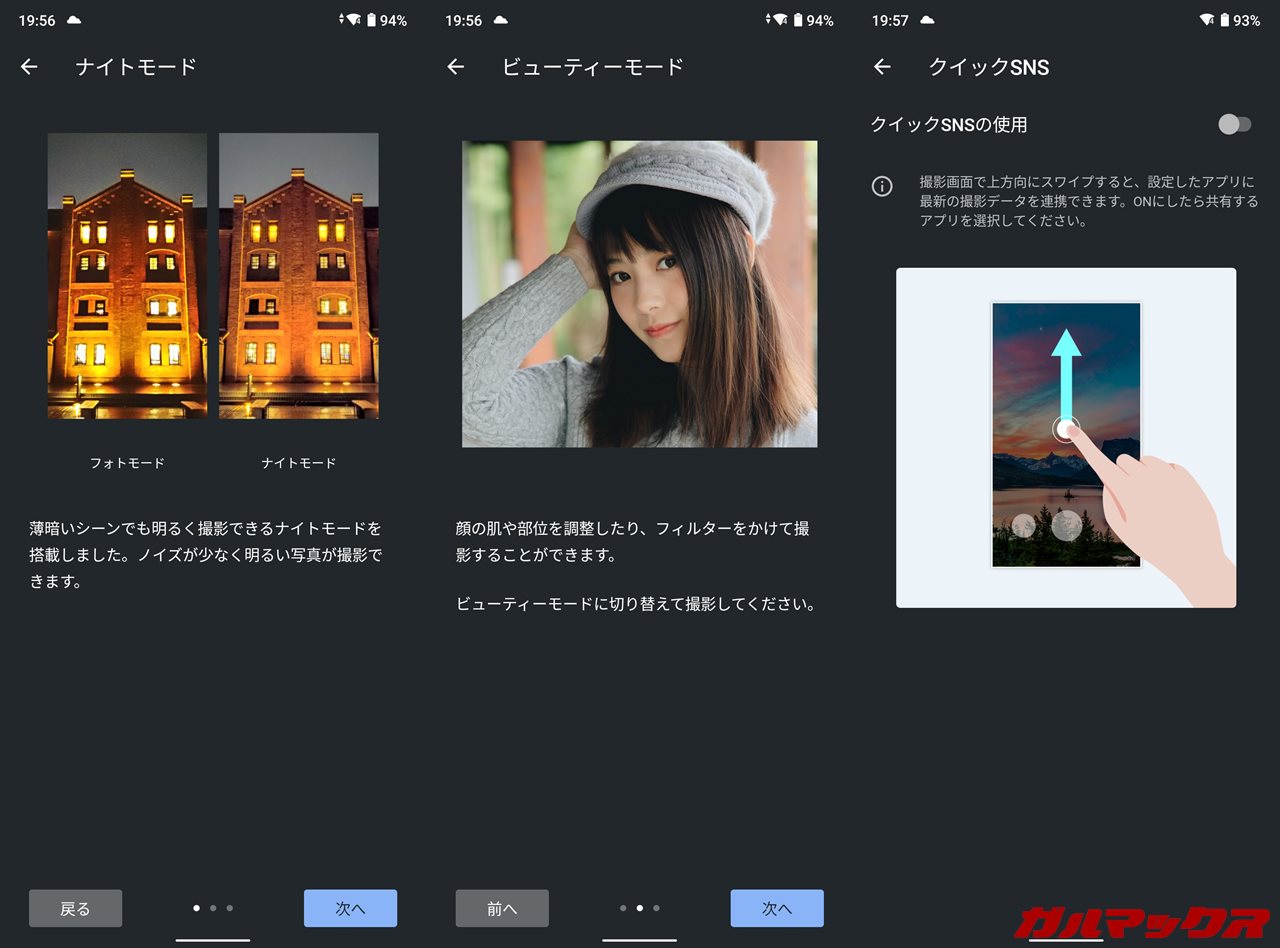 ▼日本スマホらしく、各機能の説明がしっかり用意されており親切。また撮影画面で上にスワイプすることでサクっとアプリに共有できるクイックSNS機能があるのも便利でGood!これマジで便利で他スマホでも採用してほしいわ!↓