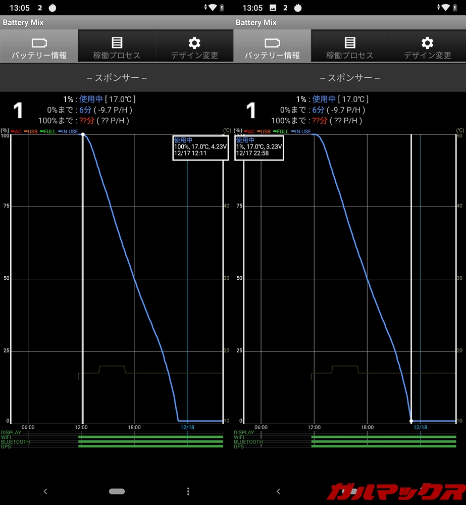 バッテリー持ちのテストではディスプレイ輝度中間設定、輝度自動調整オフの状態でマン充電から電池が切れるまでYouTubeの長時間動画を再生して測定します。データ取得アプリが記録出来る範囲までの検証となるので誤差はご了承下さい。