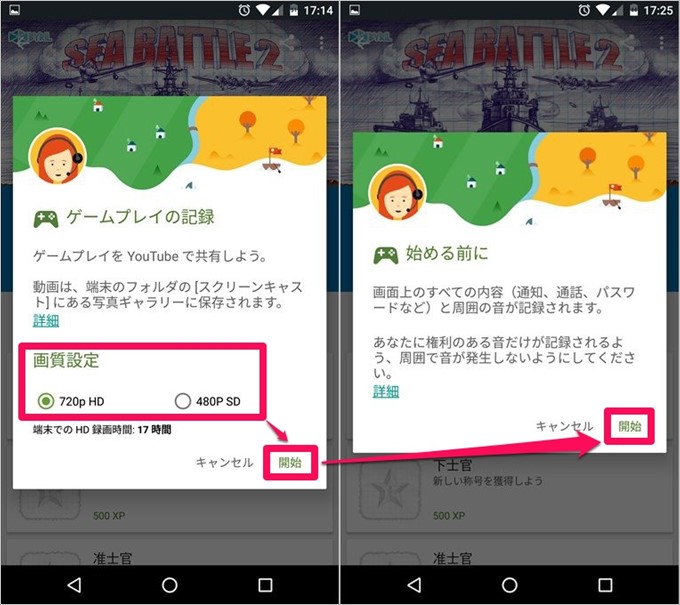 ↓画質設定を選択して注意事項を確認したら開始を選択。今回の録画では720p HDで録画を行った。