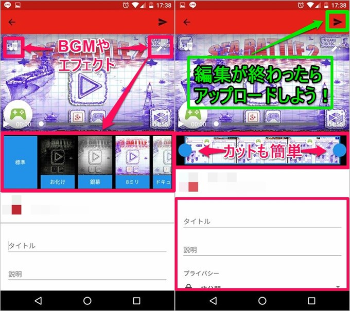 ↓「編集してYouTubeにアップ」を選択すると、直接YouTubeアップロード画面に移動するので、BGMの追加、エフェクト加工、動画のカット等の編集、タイトルや説明などを編集しましょう。全ての編集が終了したら飛行機マークをタップしてアップロードしましょう。
