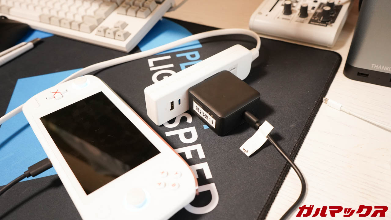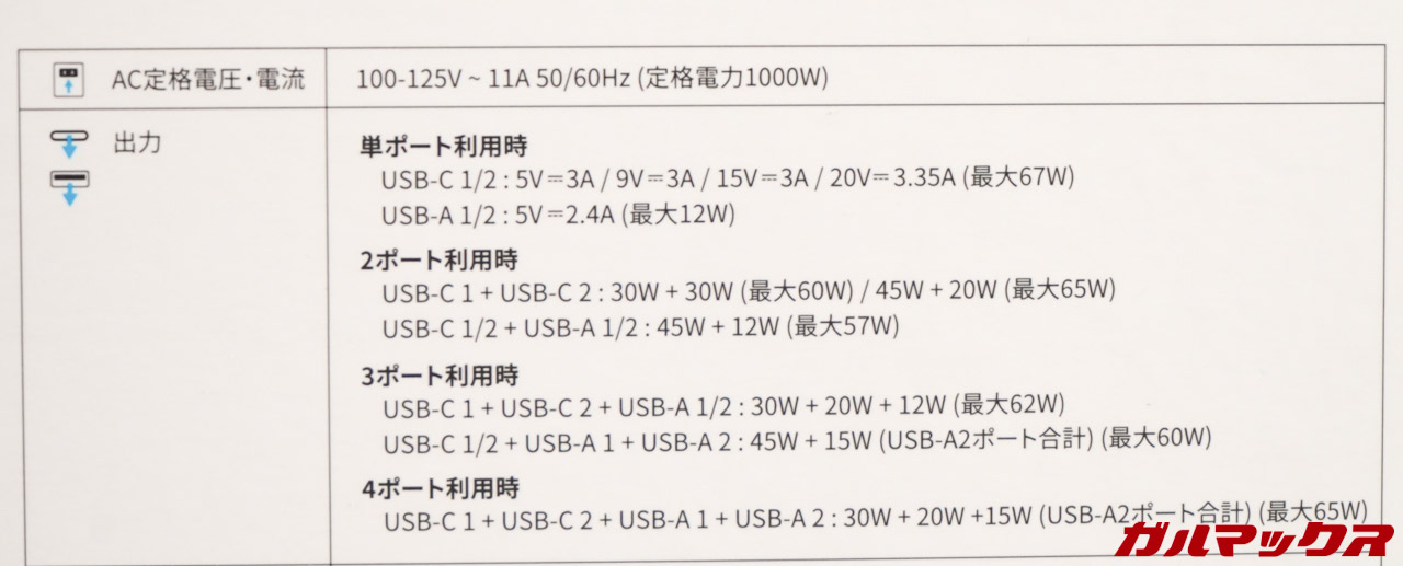 まあ2ポート以上使ってるときでもUSB-Cは30W出力できるからそれほど困ることは無いと思うが、出力が心配なら背面のコンセントを使って純正のチャージャーを使えばよろし。