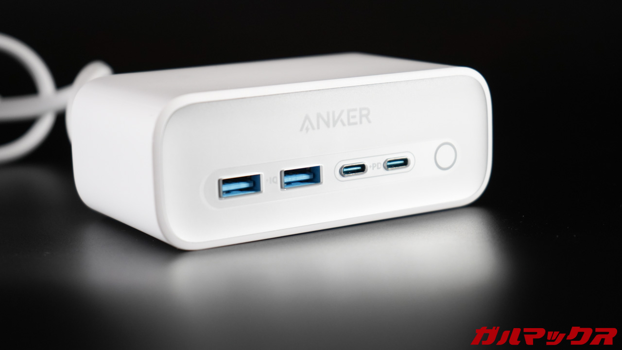 Anker 525 Charging Stationは前面にUSB-Aが2つ、USB-Cが2つ備わっていて背面にはコンセントが3つも備わっているのであるッ!