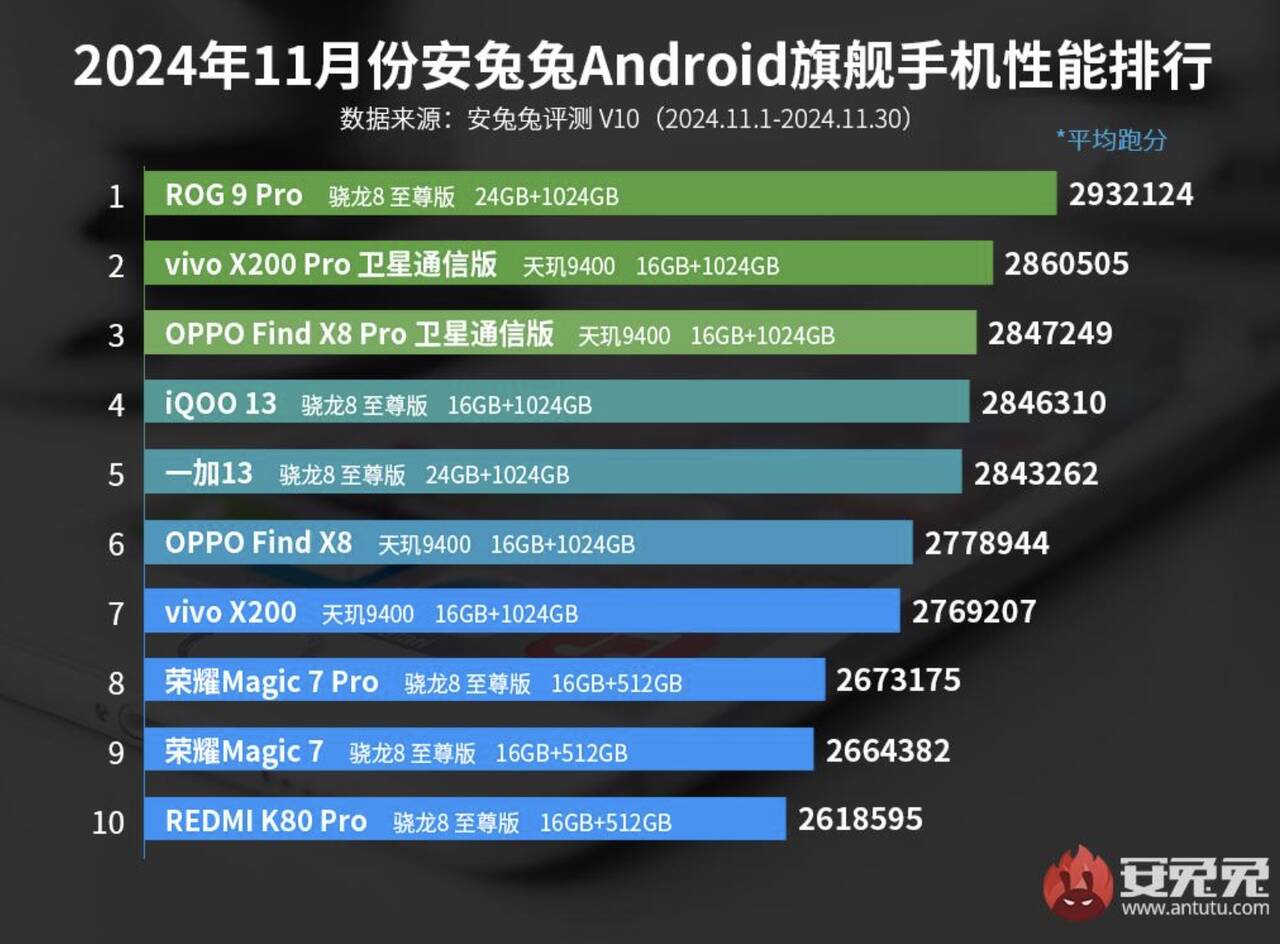 AnTuTuの11月ランキングはSnapdragon 8 Elite搭載のROG Phone 9 Proが首位