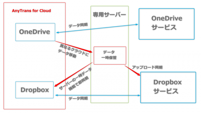 ▼イメージとしてはこんな感じ。データのアップロードや同期に専用サーバーを介する事で、一時ファイルが瞬時に異なる(AnyTrans for Cloud上の)クラウド間で同期されます。本サービスへは専用サーバーからデータが同期されるので、ユーザー側は通常のインターネット経由でのデータやり取りよりも圧倒的に体感速度が向上しているように感じるのです。↓