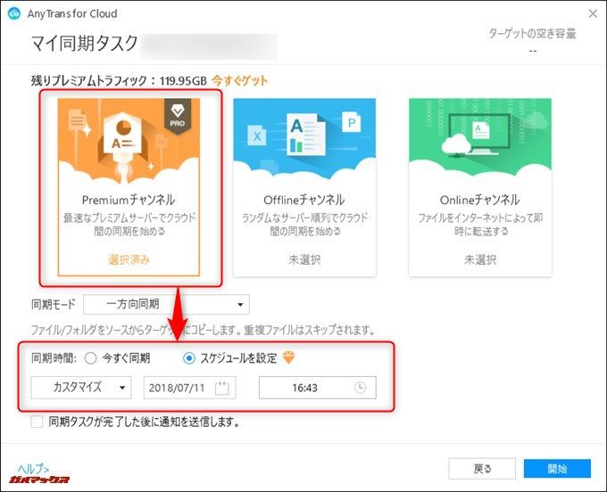 Premiumチャンネルの優位性は異なるクラウドストレージサービスでのデータ同期の速さだけではありません。Premiumチャンネルユーザーは全チャンネル(前述した通り、各チャンネルでデータを扱う際の体感速度がことなります)で利用できるファイルの即時同期だけでなく、日時を指定したバックアップ機能も利用できるようになります。