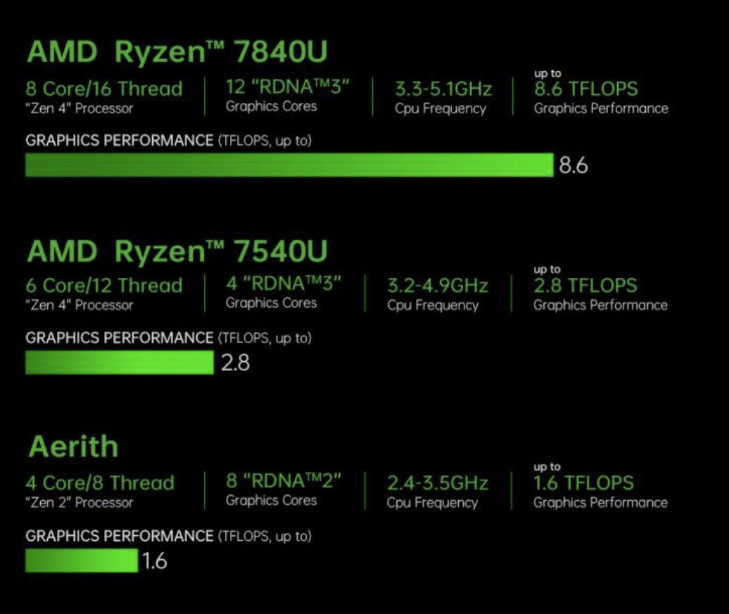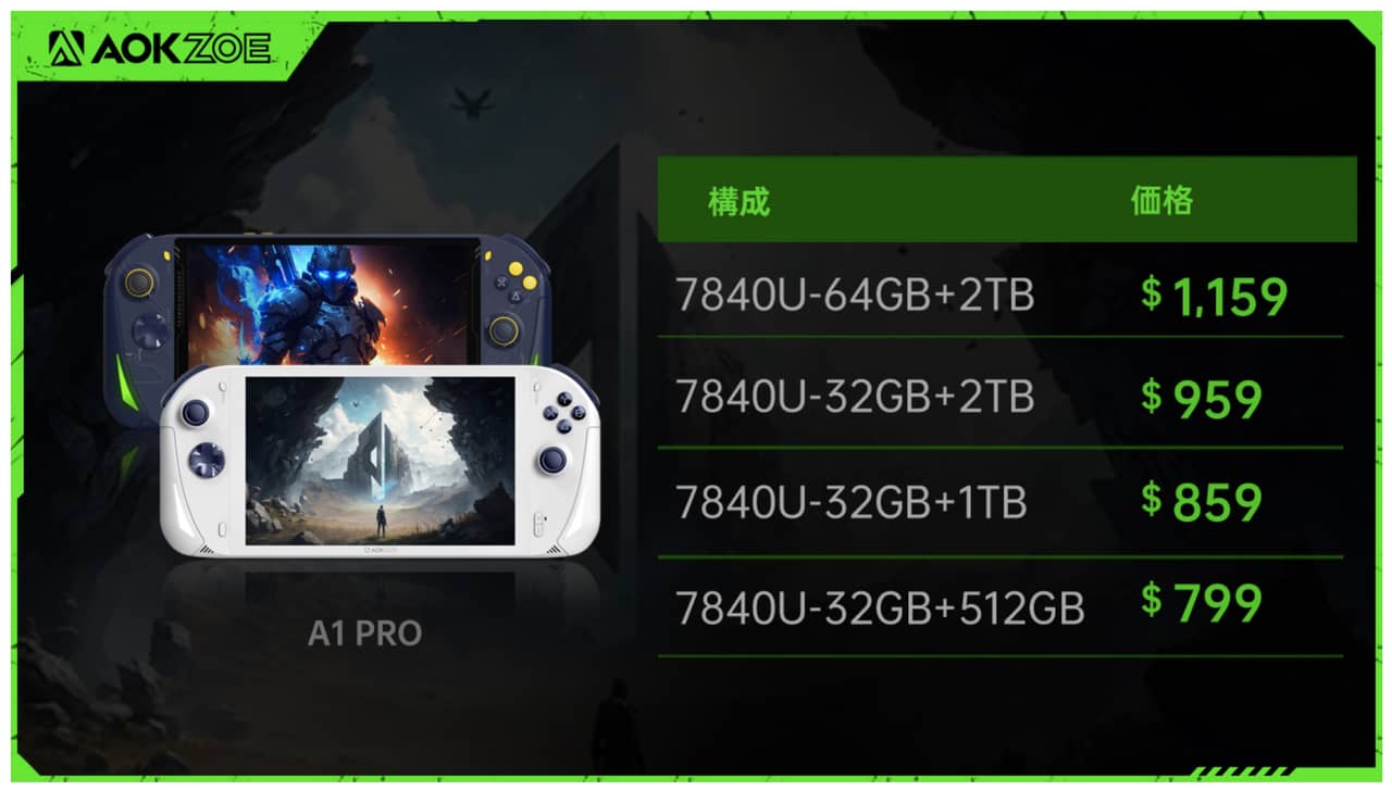 ▼ちなみにAOKZOE A1 PROは4モデル展開。気になるCPU構成だが、どのモデルも最新のRyzen 7 7840Uを搭載しちゃってるのである!…最小構成が799ドルってのも良いとこ突いてるなこれ。↓
