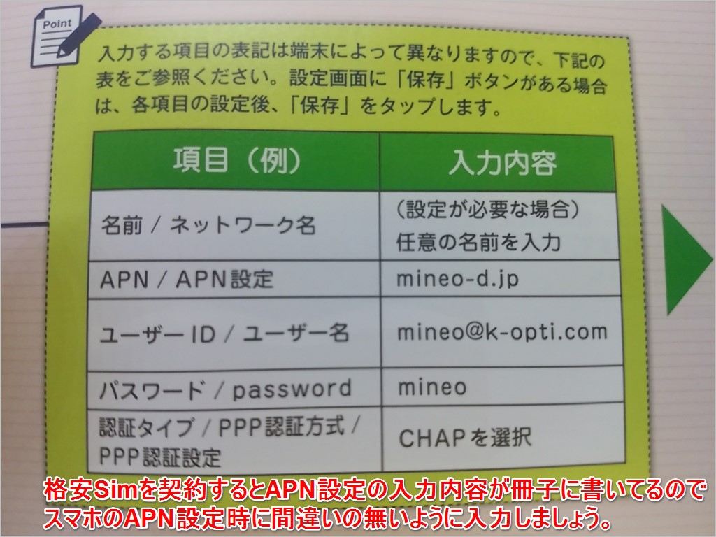 ↓格安SIMを契約すると、通信するための「APN設定入力内容」が冊子等に記載されているので、端末で入力します。