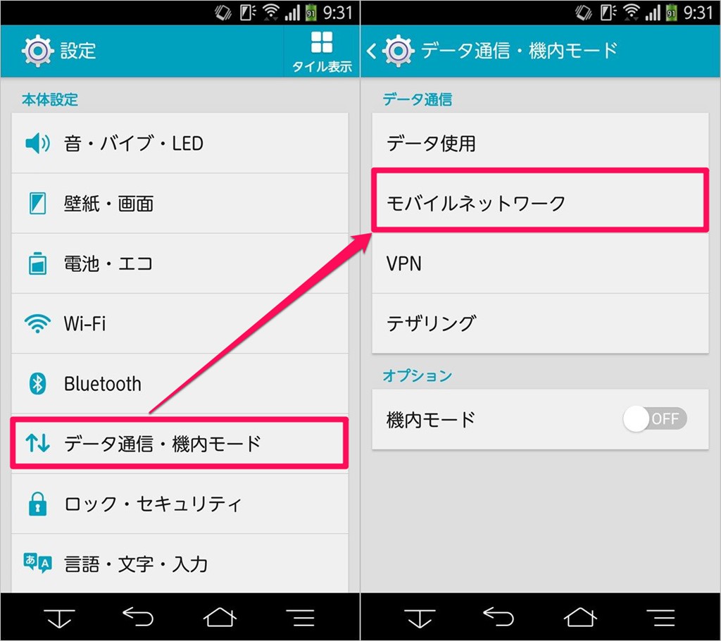 ↓スマホの設定からモバイルネットワークへ