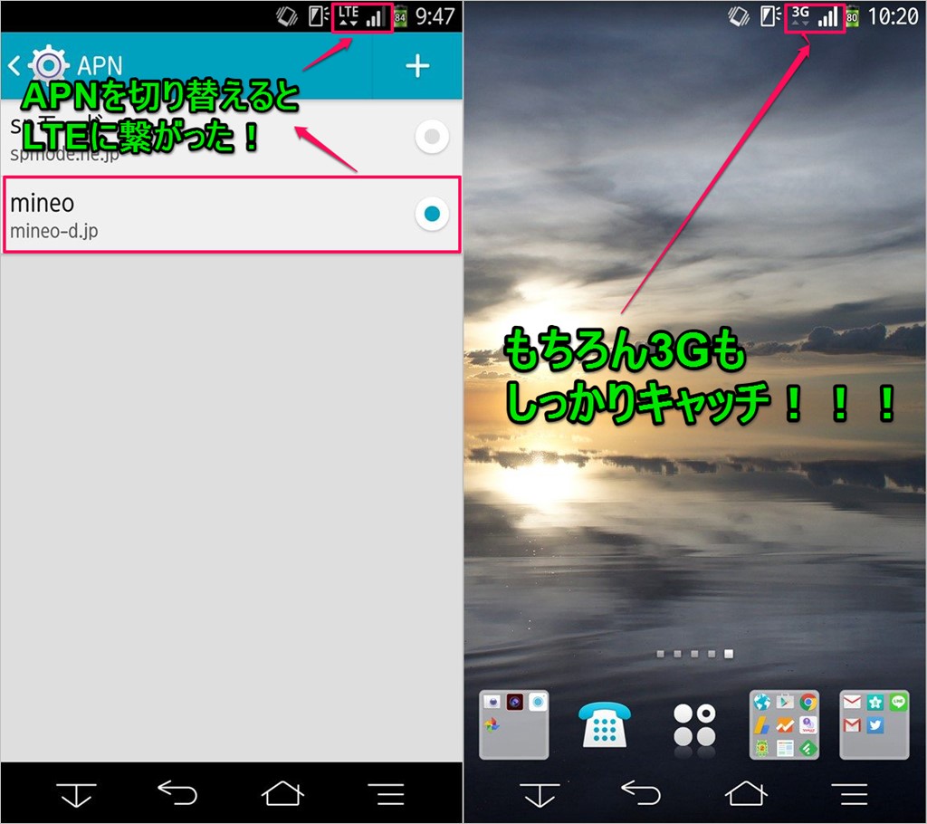 ↓電波マークの横にdocomoならLTE、auなら4Gと表示されればLTEで通信可能状態です!LTEと3Gどちらも電波を掴みました!めでたしめでたし!