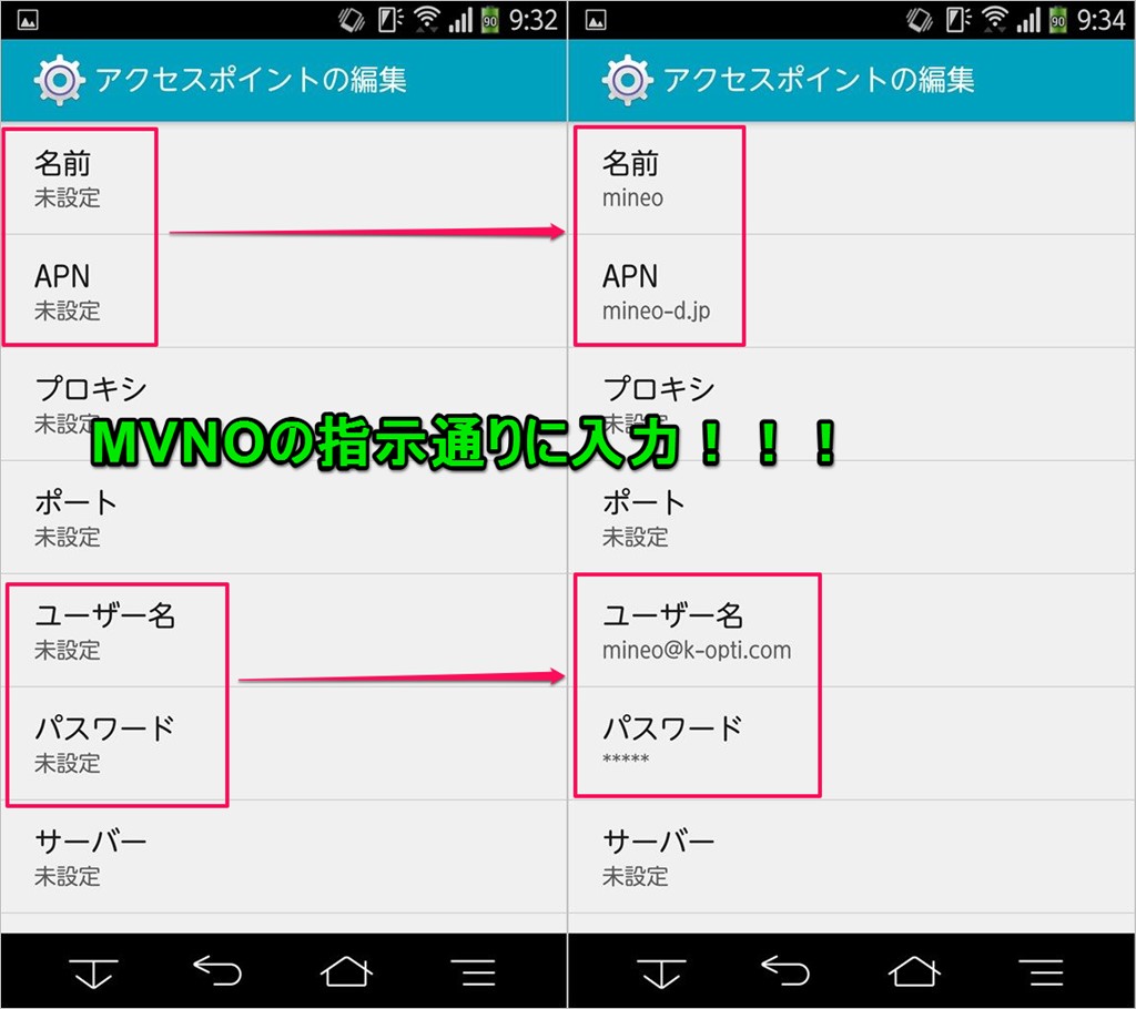あ、いい忘れていましたが、Android端末での「APN設定方法」はどの格安SIMでも同じですよ!今回は私が利用しているmineoというMVNOの格安SIMで解説しています。