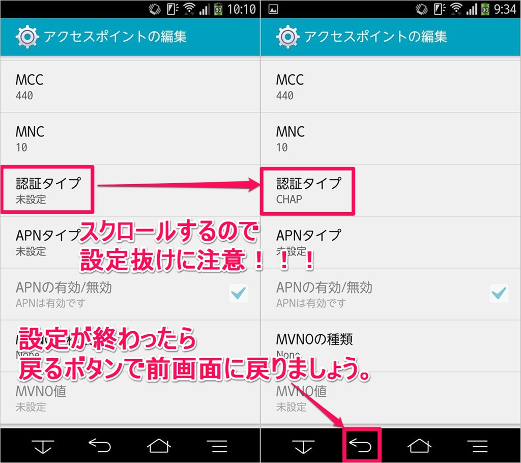 ↓APN設定項目は沢山ありますが、設定箇所は多くはないです!スクロールして設定該当箇所の見落としが無いように注意しましょう!全ての設定項目の入力後、端末により「保存ボタン」がある場合は保存してから戻るボタンで前画面へ。私の端末では保存ボタンがなかったので、入力後に戻るボタンで勝手に保存されてました!
