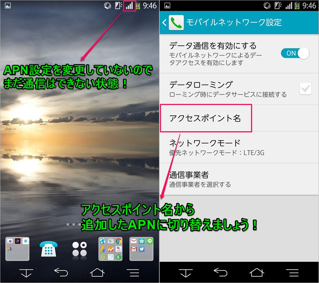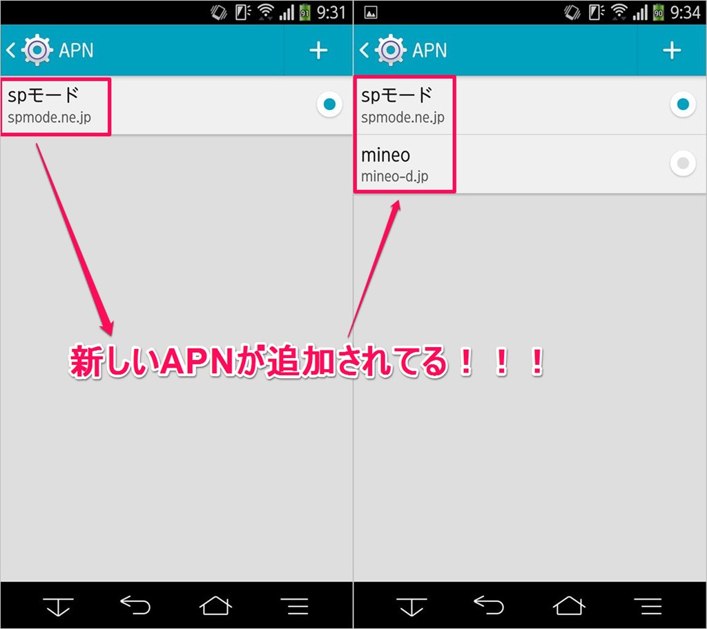 一度APN設定した項目は任意に破棄しない限り端末に保存されますので、以降はdocomoのSIMと格安SIMを差し替えてAPN設定を切替えるだけでオッケー。