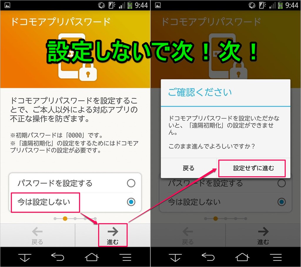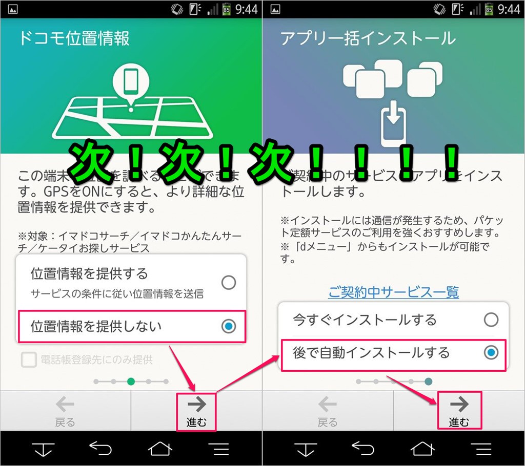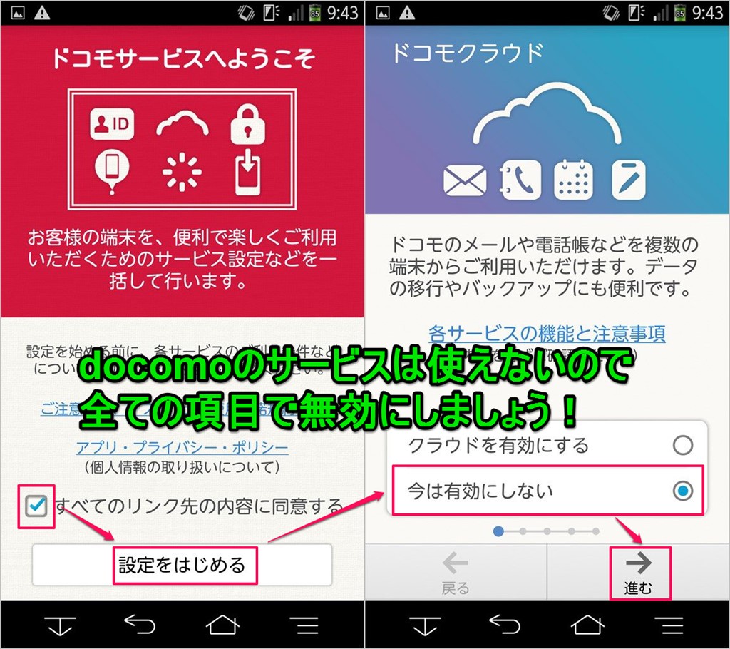 ↓スマホの電源をONにすると、docomo端末の場合、docomoが提供しているサービス設定画面が表示されますが、docomoのSIMでしかdocomoのサービスは利用できないので、スルーしまよう!