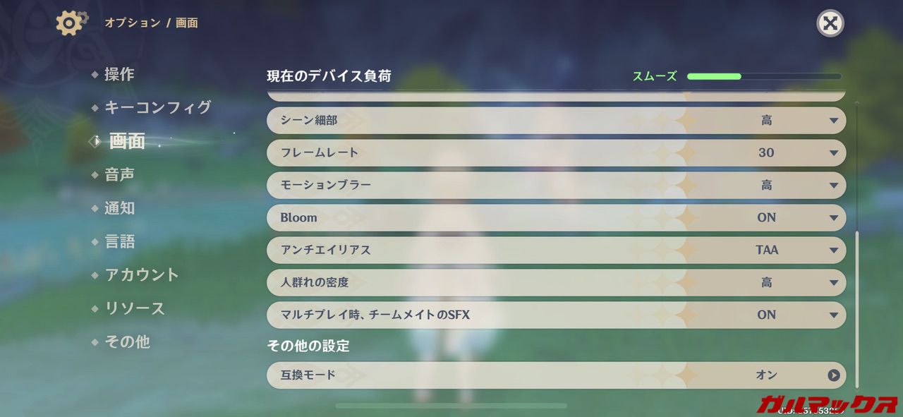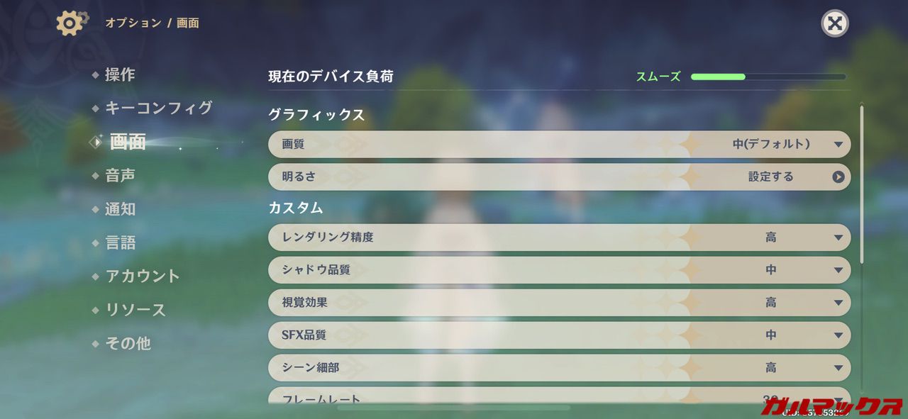ゲーム性能の検証でよく見かける原神での画質最高+60FPS設定はSoCの底力を見るためのベンチ的な設定です。このような設定は発熱も高くなり電池持ちも悪くなります。「ゲームを快適に遊びたい」という本来の目的であれば、ゲームのグラフィック設定は妥協できるまで下げて負荷を軽くする方向性の煮詰め方をガルマックスはオススメしています。